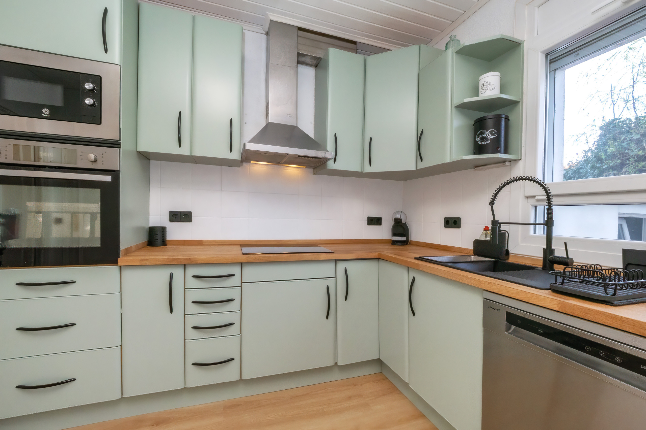 The kitchen is equipped with a refrigerator, microwave, oven, freezer, dishwasher, cooking utensils, coffee maker, toaster and kettle.